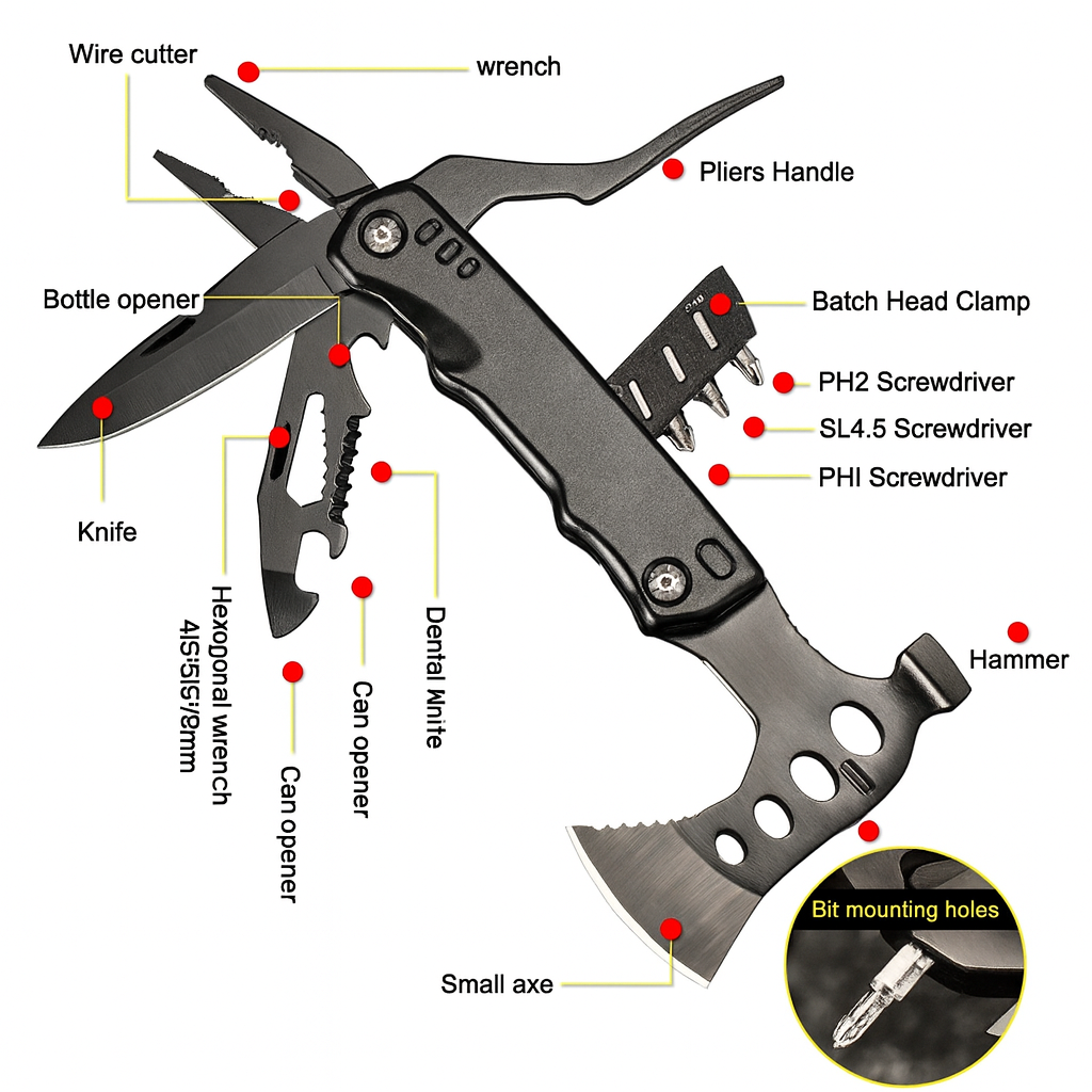 Engineered for all-terrain performance, the PODX Tactical 16-in-1 Multitool Axe & Hammer combines cutting, gripping, driving, and impact tools into one compact, high-durability survival platform. Built from precision-machined stainless steel and a reinforced aluminum handle, this tool is designed for camping, overlanding, emergency response, tactical use, and professional field operations.